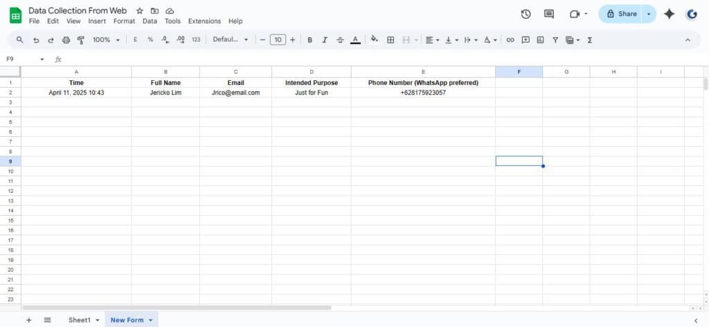 Once you've added those hidden fields, submit your form, open your connected Google Sheet and you'll see the columns are neatly ordered, unwanted fields are gone.